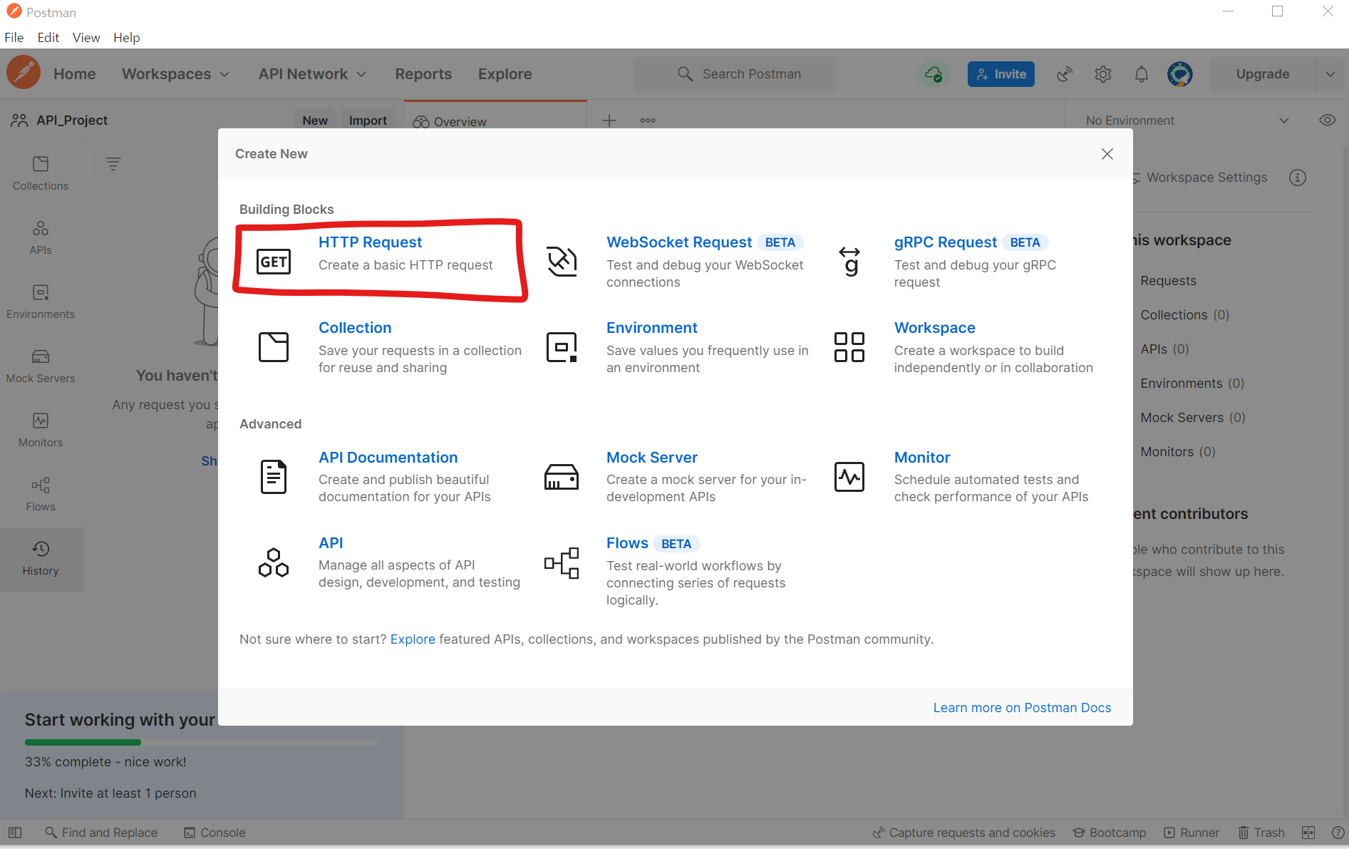 여러가지 메뉴가 나오는데, 본인은 웹 API를 사용해볼 예정이기 때문에 처음에 있는 HTTP Request 메뉴를 선택했다.