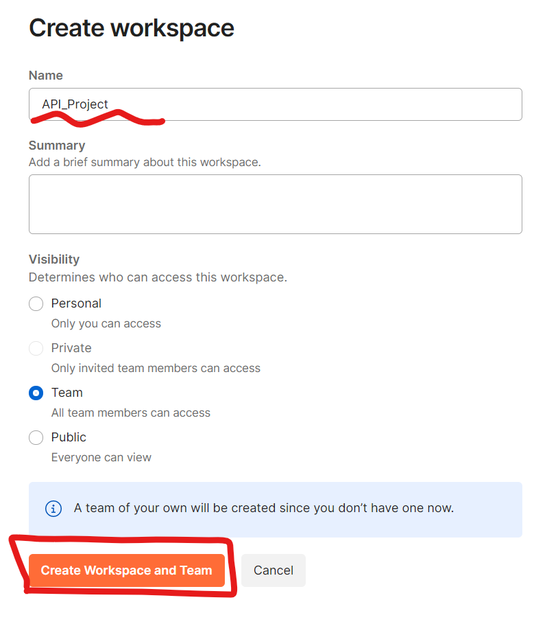 간단히 워크스페이스 이름만 넣어주면 된다. 본인은 임의로 API_Project라고 기입했다.
