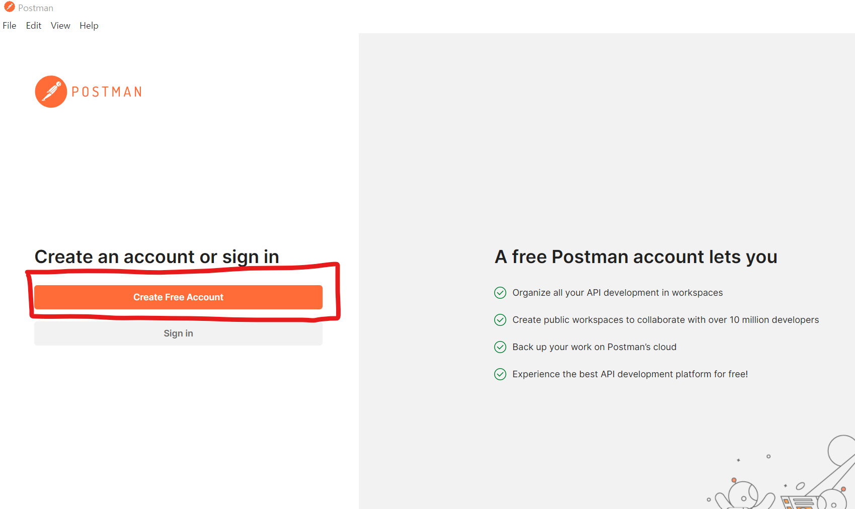 POSTMAN을 다운로드 후 설칠파일을 실행하면 바로 아래와 같이 계정 생성 화면이 등장한다.