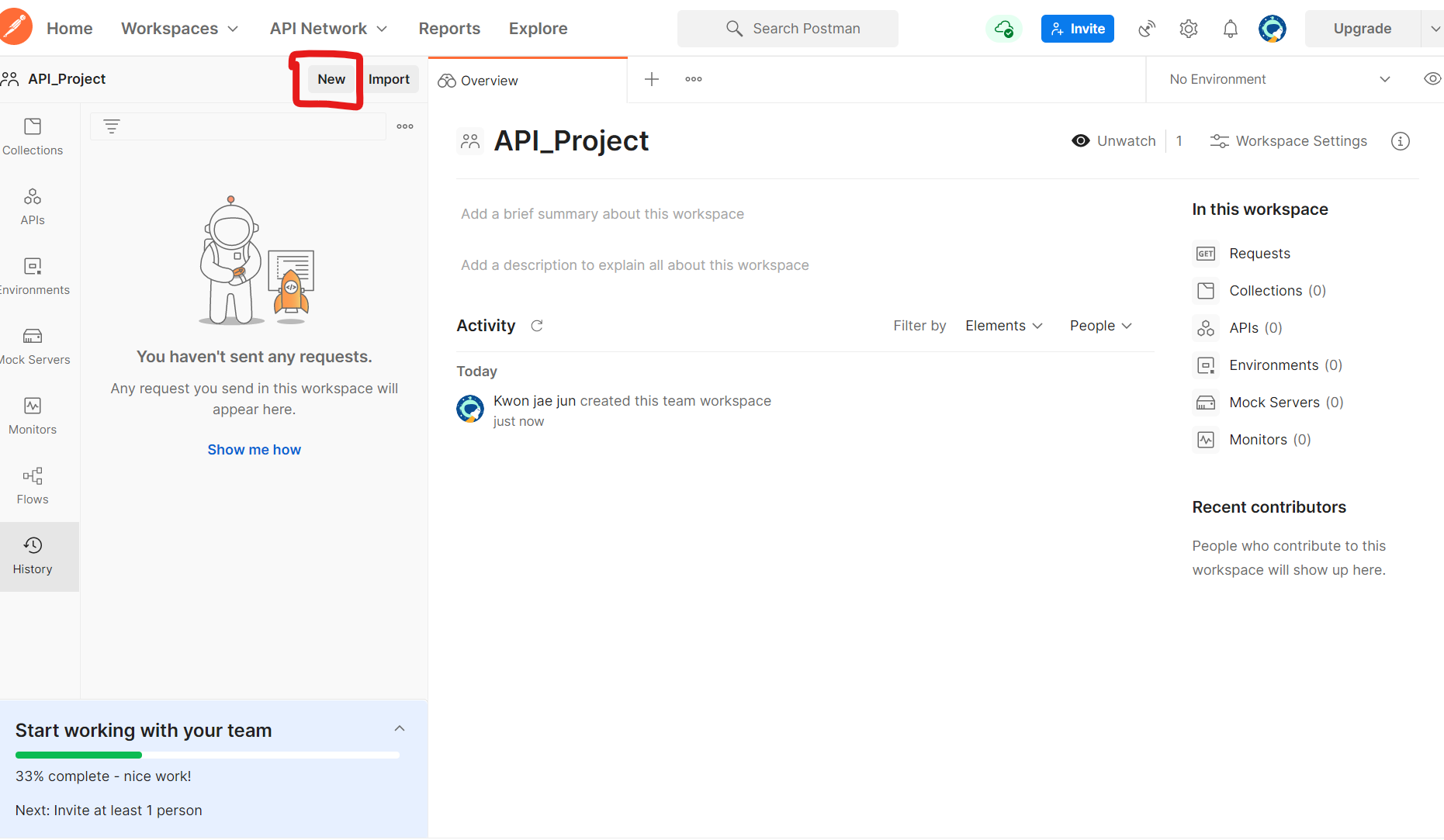 계정생성까지 마치면 POSTMAN의 홈 화면이 나타나는데