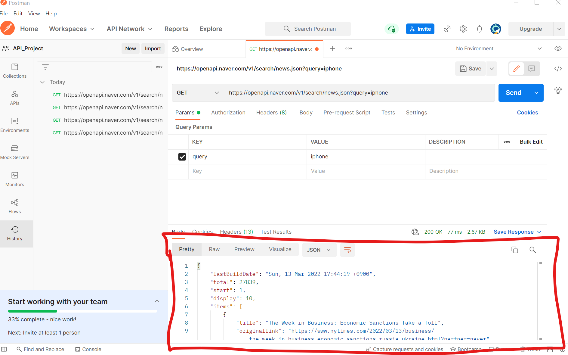 본인은 네이버 검색 API 를 사용해서 'iphone' 이라는 키워드를 가지고 있는 뉴스를 검색하는 명령을 넣어 잘 동작하는지 테스트를 해보았다.
