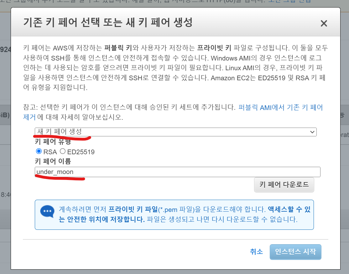under_moon(임의 입력).pem 이라는 프라이빗 키 파일이 생성 다운로드 된다.