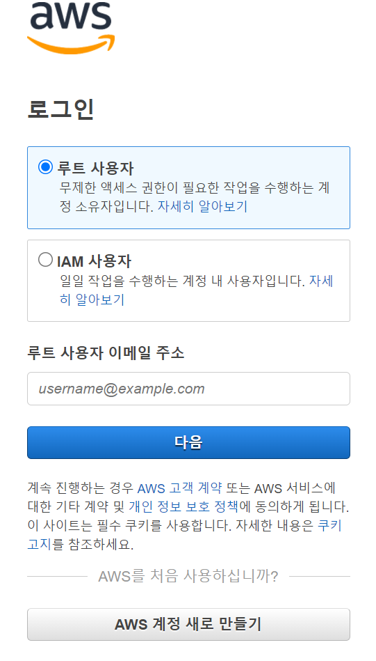 사용자가 두가지로 나뉘어져 있는 데 가입한 본이이 로그인 하는 것이니 아까 가입할 때 사용한 이메일 주소를 넣고 '루트 사용자'로 로그인하자.