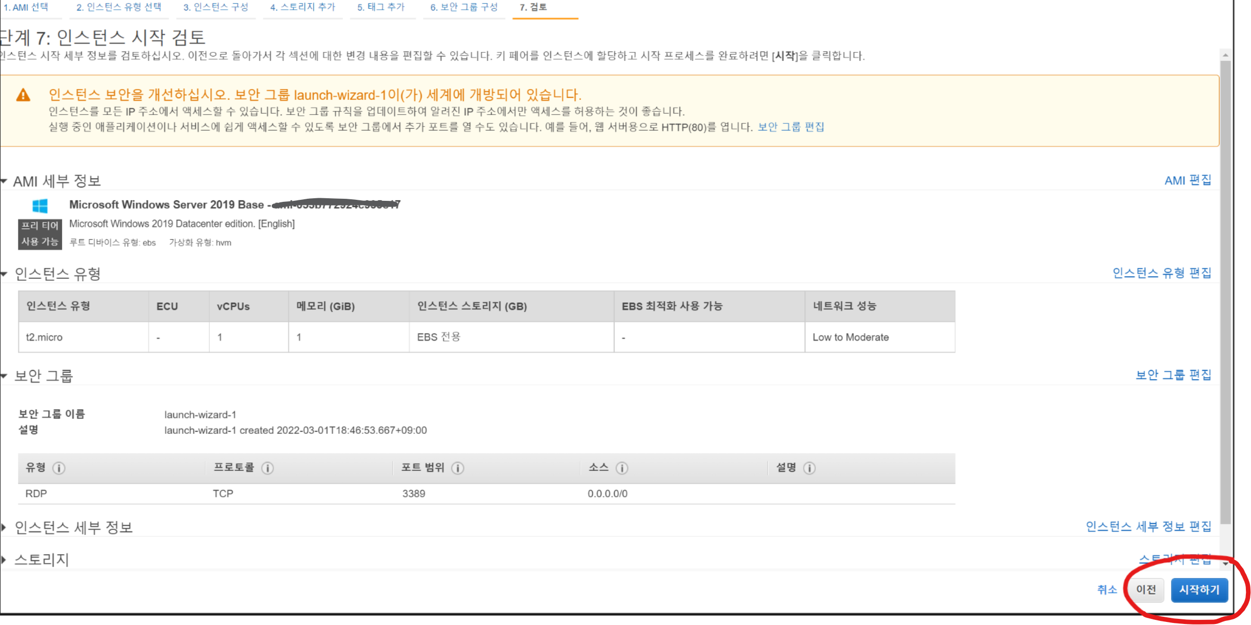 인스턴스 시작 버튼을 누르면 다음 창이 뜬다. 크게 신경쓸 건 없는 것 같으니