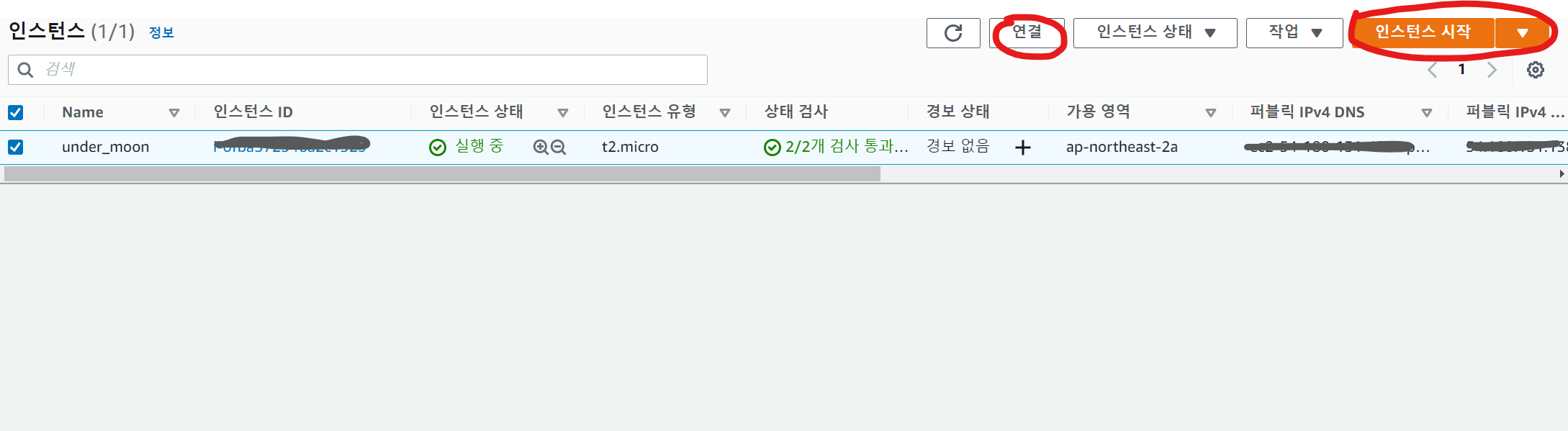내가 생성한 인스턴스(가상머신)이 뜬다. 여기서 '연결' 버튼을 누르면 원격 접속이 시작된다.