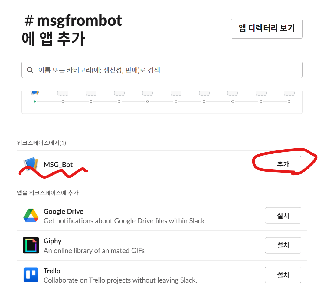 추가할 앱 목록 중에 자기가 생성한 Slack App를 '추가' 해준다.