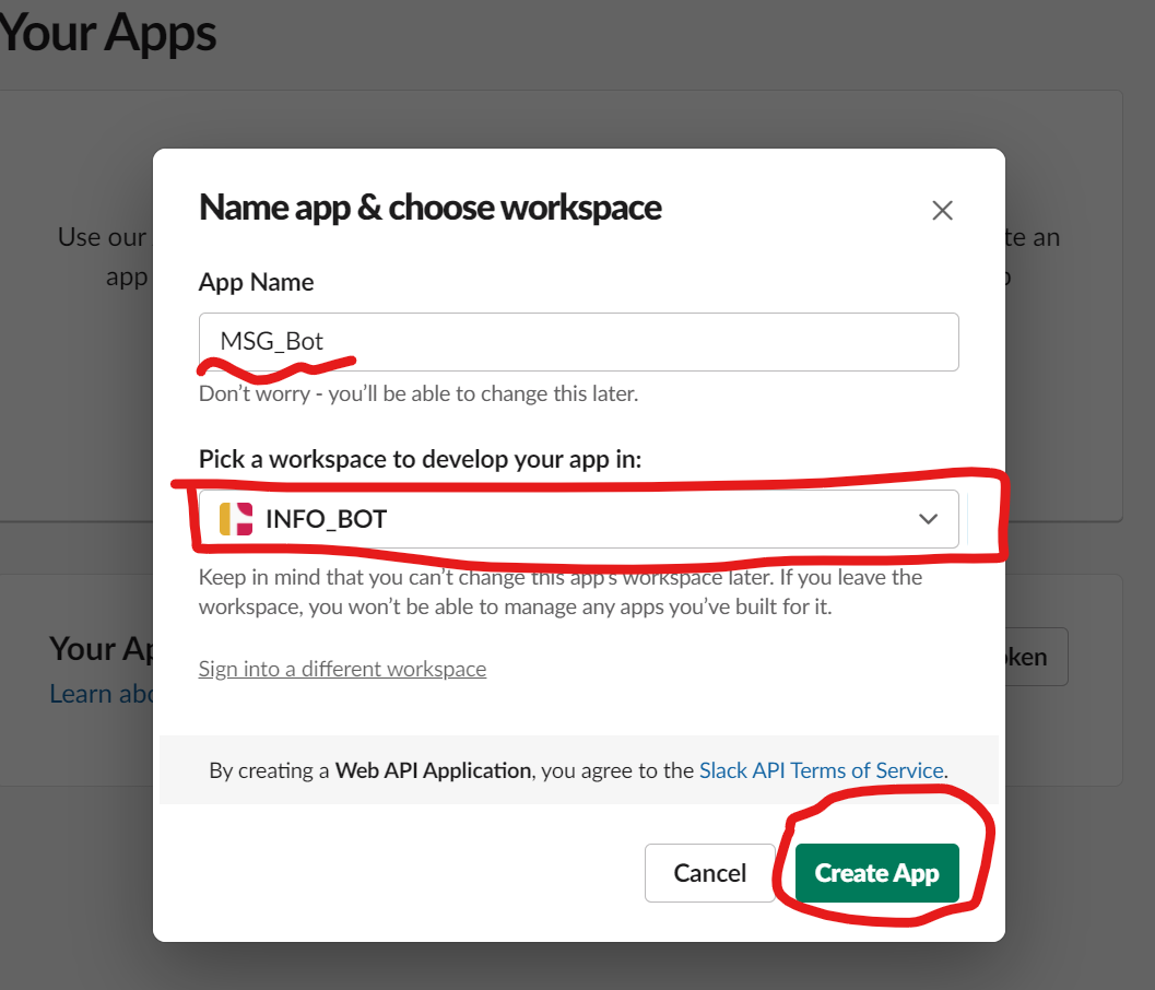 c. 새로 만들 Slack APP 이름과 그 Slack APP이 활동할 워크플레이스를 선택하자.