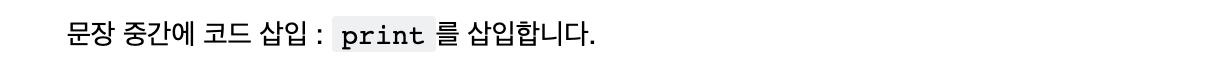 문장 중간에 코드 삽입 : `print`를 삽입합니다.